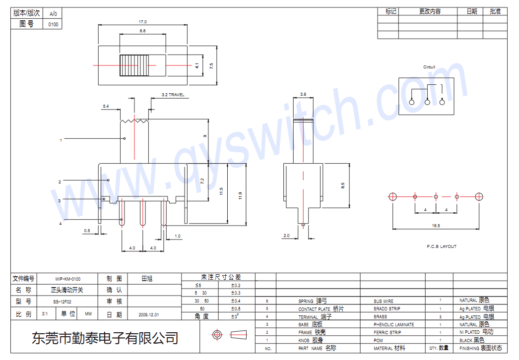 | 額定電流Electrical Ratings::0.3A 50V DC |